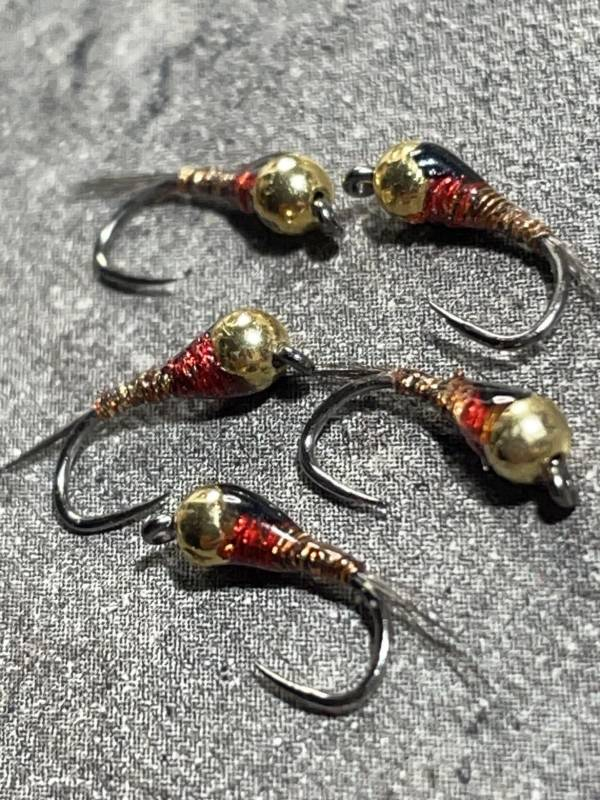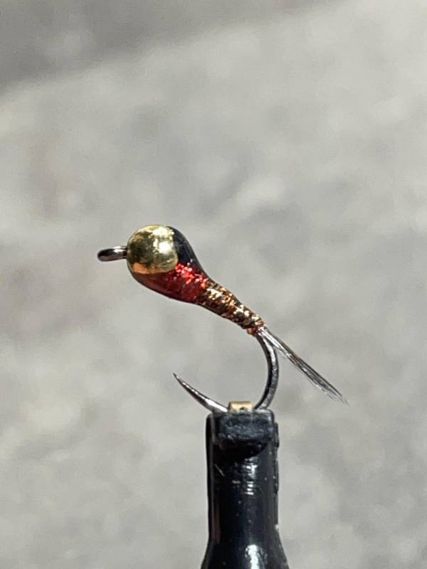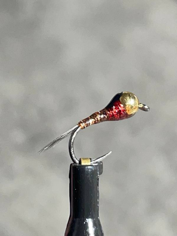 La brown nymphe montée sur le hameçon fort de fer (spn),corps en fil holographique marron et son thorax rouge, sa bille or ,cette nymphe reste efficace en début saison sur les rivières de France et d'Espagne