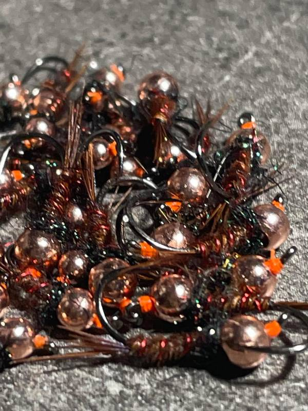 La cerise montee sur hamecon fort de fer, le corps en faisan cerclé de fil cuivre rouge, le torax en subsitue de phoque noir et vert, tete bille cuivre et tag orange a l'oeillet la cerise est une nymphe qui date pas d'aujourd'hui ......je l'utilise dans les régions du sud de la France et en Espagne elle reste efficace en tandem ou en solo et même en seche nymphe