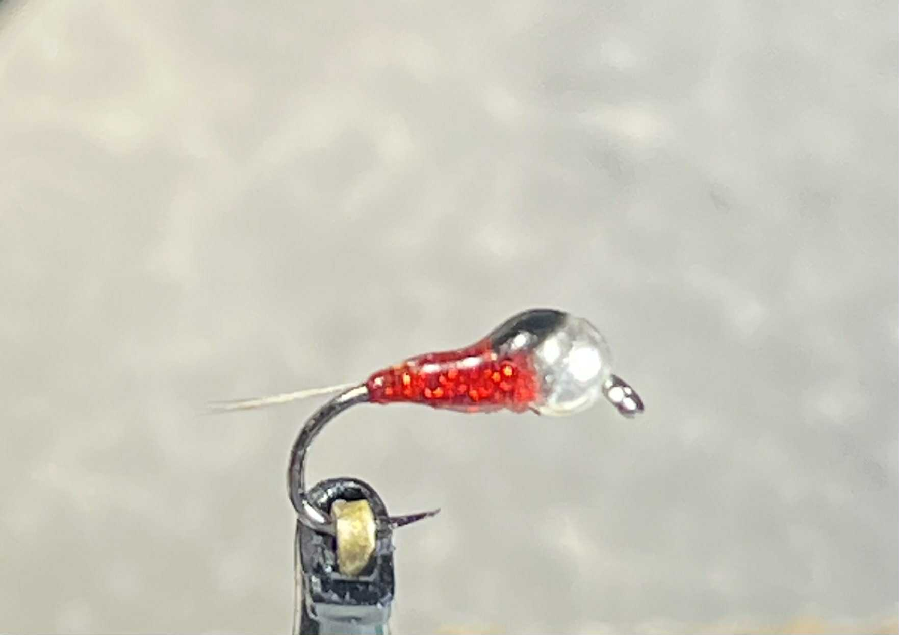 Nymphe rouge holographique, montée sur le hameçon fort de fer elle est efficace toute la saison, sur tous les types de rivières pour la truite et l'ombre. À utiliser en pointe ou en potence.