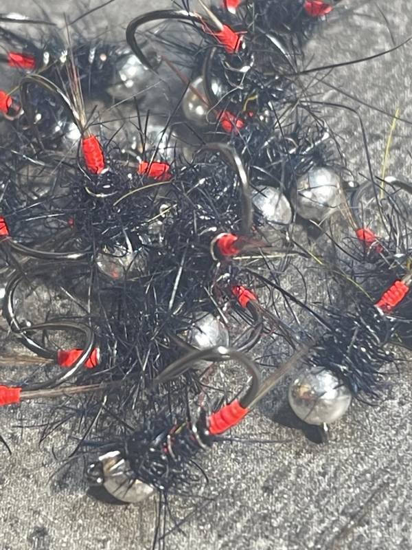 Nymphe tag rouge et noire cerclé de fil d'argent et thorax en substitue de phoque noire , montée sur hameçons fort de ferqui a fait ses preuves autant pour la truite que pour l'ombre tout au long de la saison.À avoir dans ses boîtes!