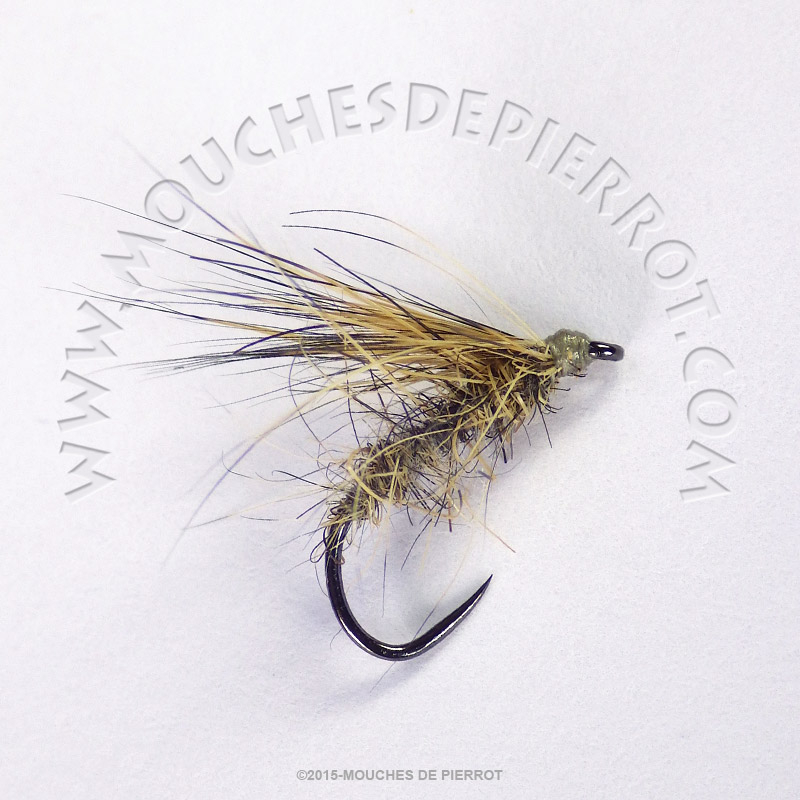 Mouche montée sur un hameçon sans ardillon de haute qualité (hns), corps et ailes en lièvre naturel.